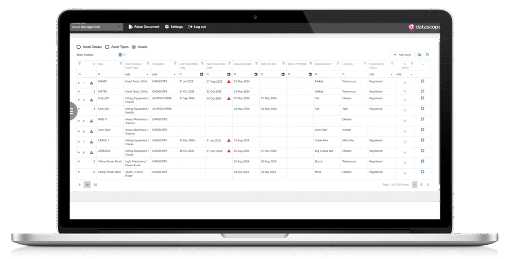 Unlike generic systems, DataScope is built specifically for construction. It integrates workforce data, time and attendance, and safety records with asset management. That means only competent operatives can book specific assets, and managers have a complete audit trail of who used what, when, and how safely.