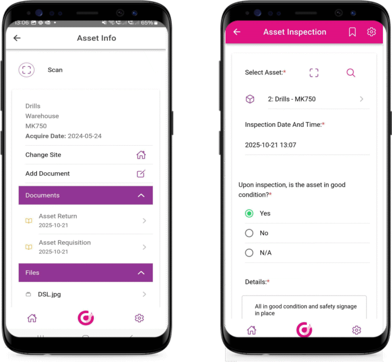Inspection routines can be recorded in the app, with issue reporting, photo capture, and audit trails. Teams know exactly when equipment is due for checks, preventing unsafe use and reducing risk.